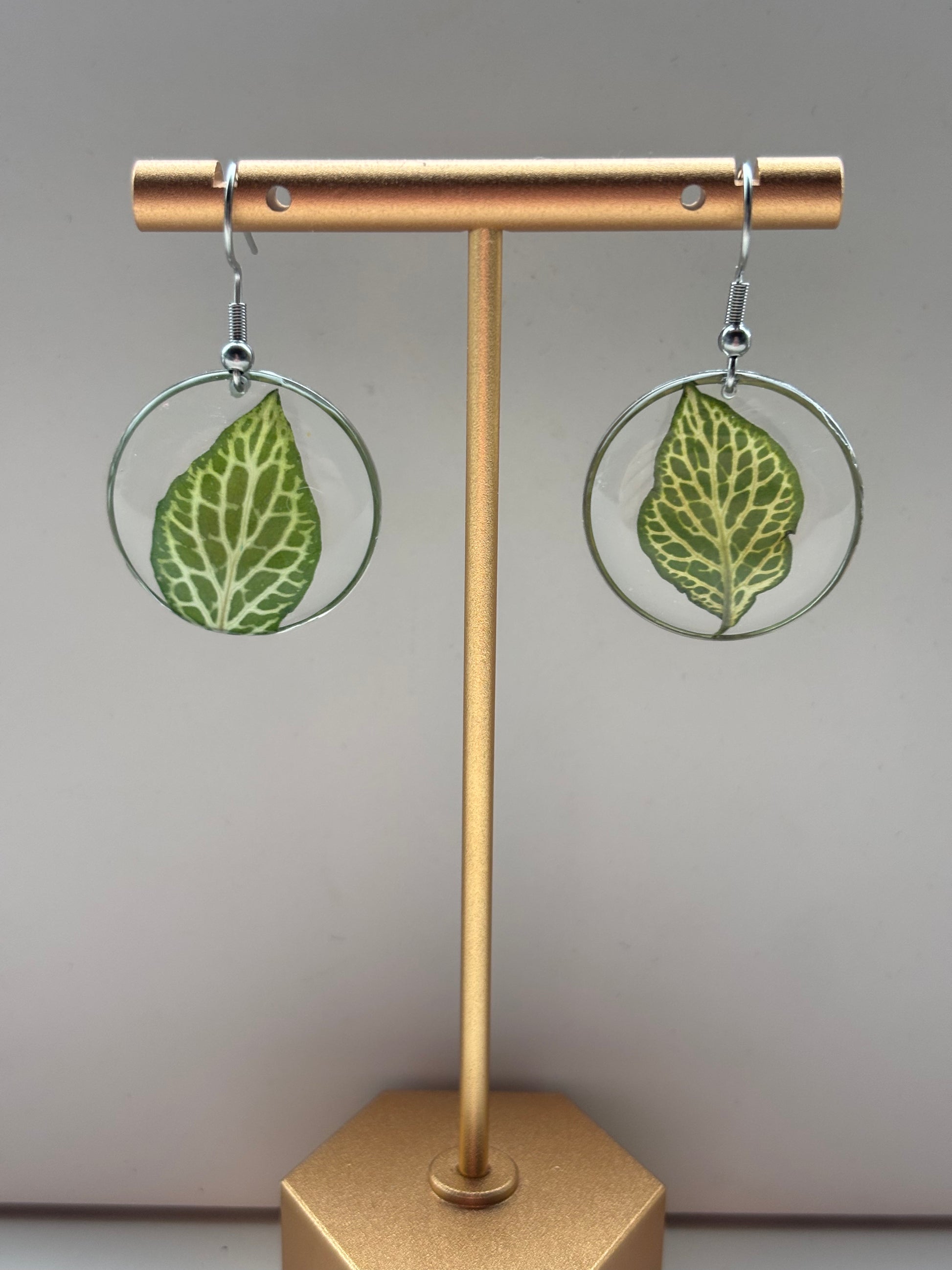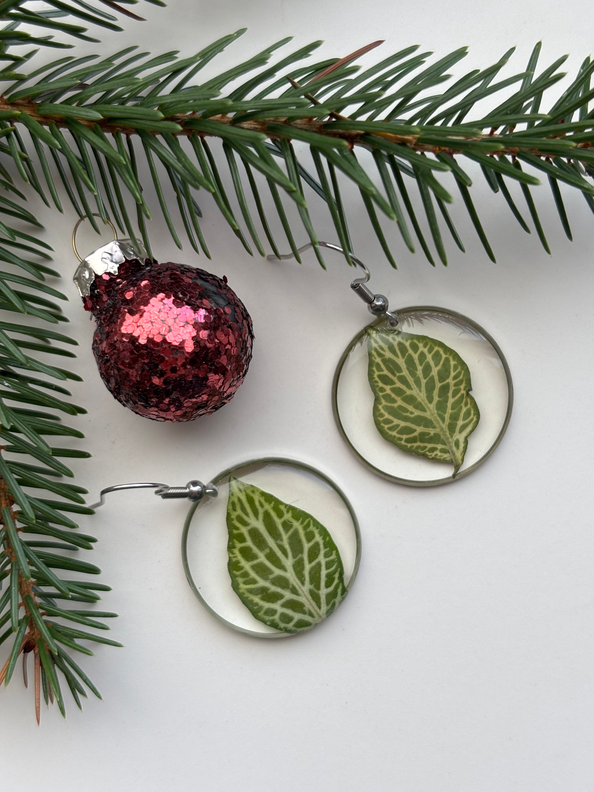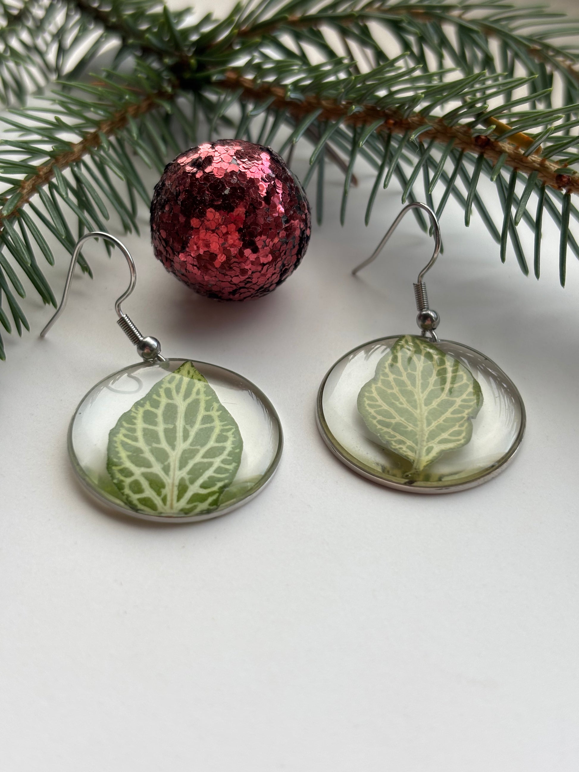 Handgemaakte oorbellen van echte bloemen – fittonia blad in epoxyhars (ca. 3 cm)