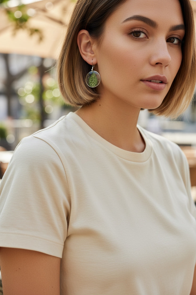 Een verfijnd botanisch detail om elke dag te dragen. Deze handgemaakte oorbellen van echte bloemen bevatten een klein, prachtig bewaard fittoniablaadje, ingebed in heldere epoxyhars. De natuurlijke nerven en groen-witte tekening van het blad komen schitterend tot hun recht binnen de ronde vorm van de hanger, waardoor het lijkt alsof je een miniatuur plantenkunstwerkje met je meedraagt.