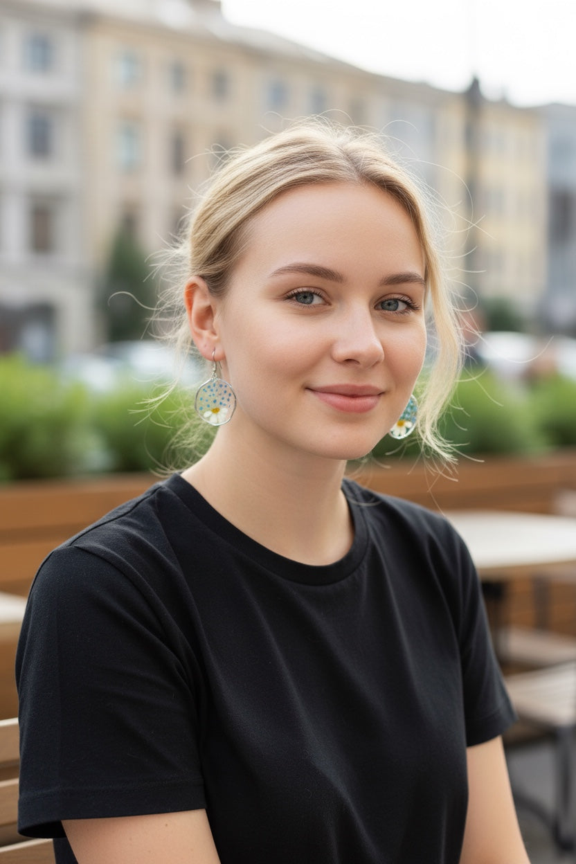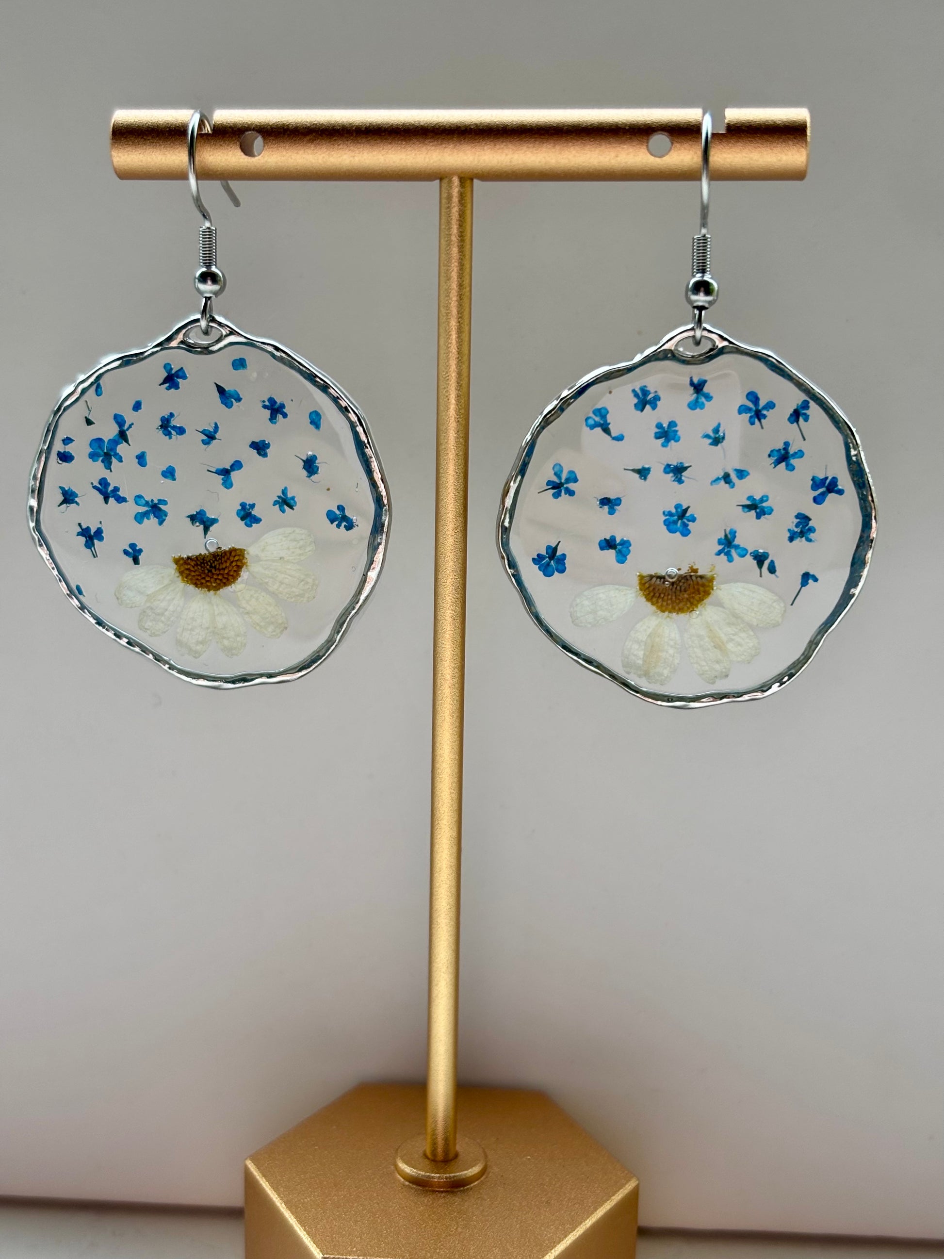 Alsof je een klein stukje zomer bij je draagt. Deze handgemaakte sieraden van echte bloemen vangen het licht op een zachte manier en laten de natuurlijke schoonheid van de geverfde blauwe Queen Anne’s Lace en margrietjes schitteren in heldere epoxyhars. Elk detail lijkt te dansen in de transparantie, alsof de tijd even heeft stilgestaan.