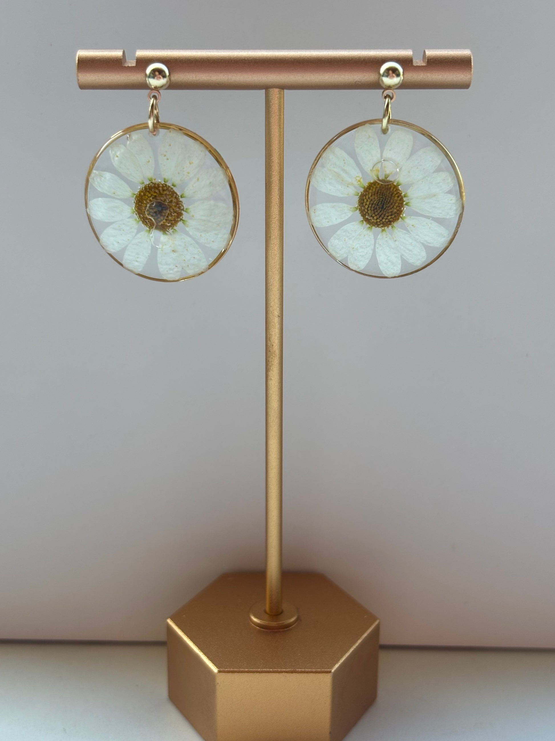 Deze charmante oorbellen brengen een vleugje voorjaar met zich mee – het hele jaar door. In de ronde, goudkleurige hanger is een echte, gedroogde madelief zorgvuldig ingebed in heldere epoxyhars. Het resultaat is een speels en verfijnd ontwerp dat lichtheid en natuurlijke schoonheid uitstraalt. Dit zijn oorbellen van echte bloemen – uniek en met de hand gemaakt.