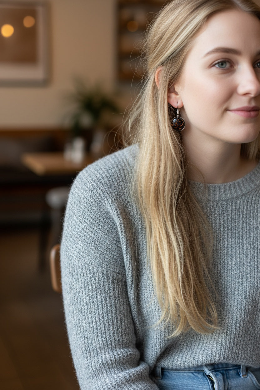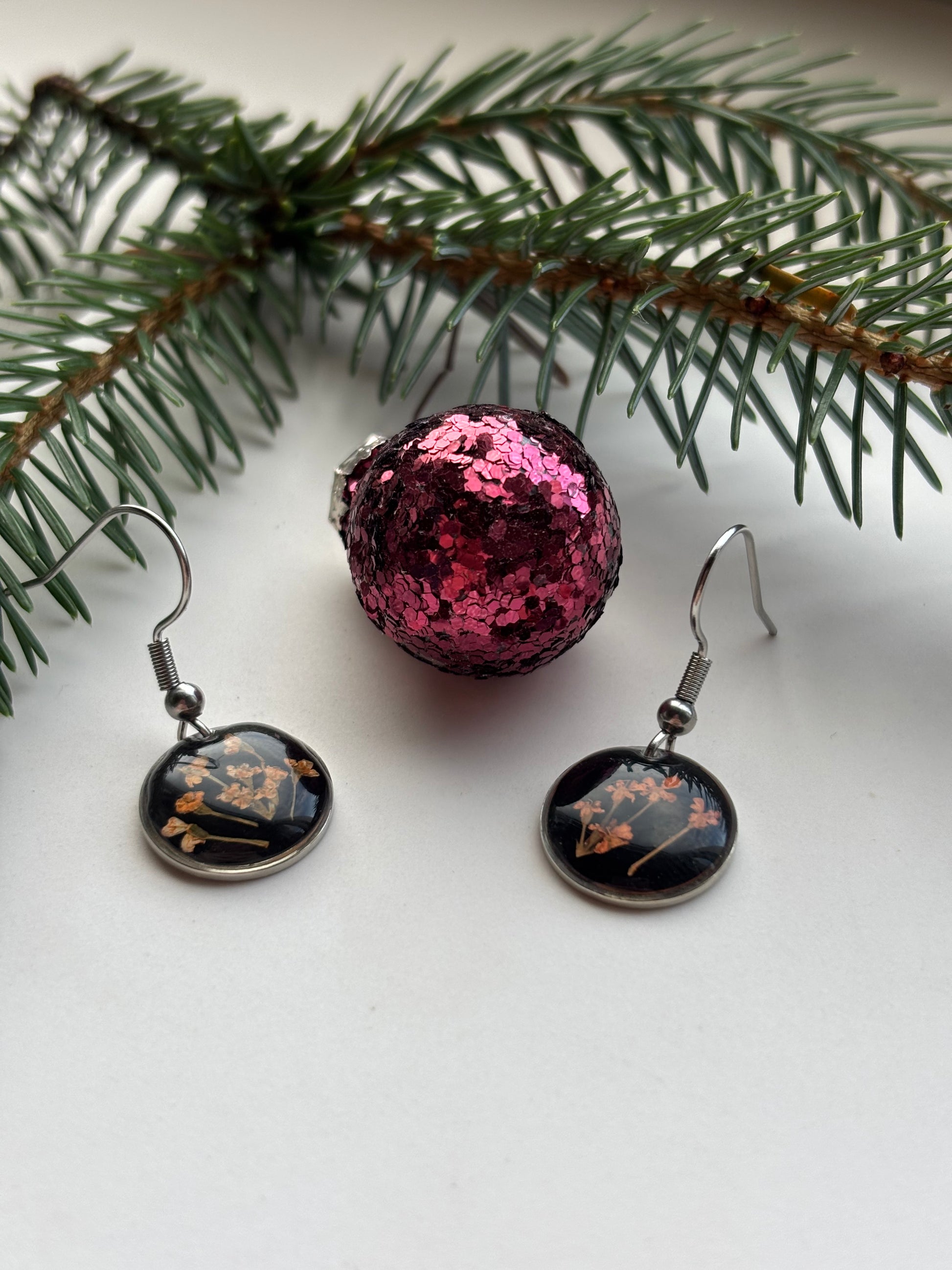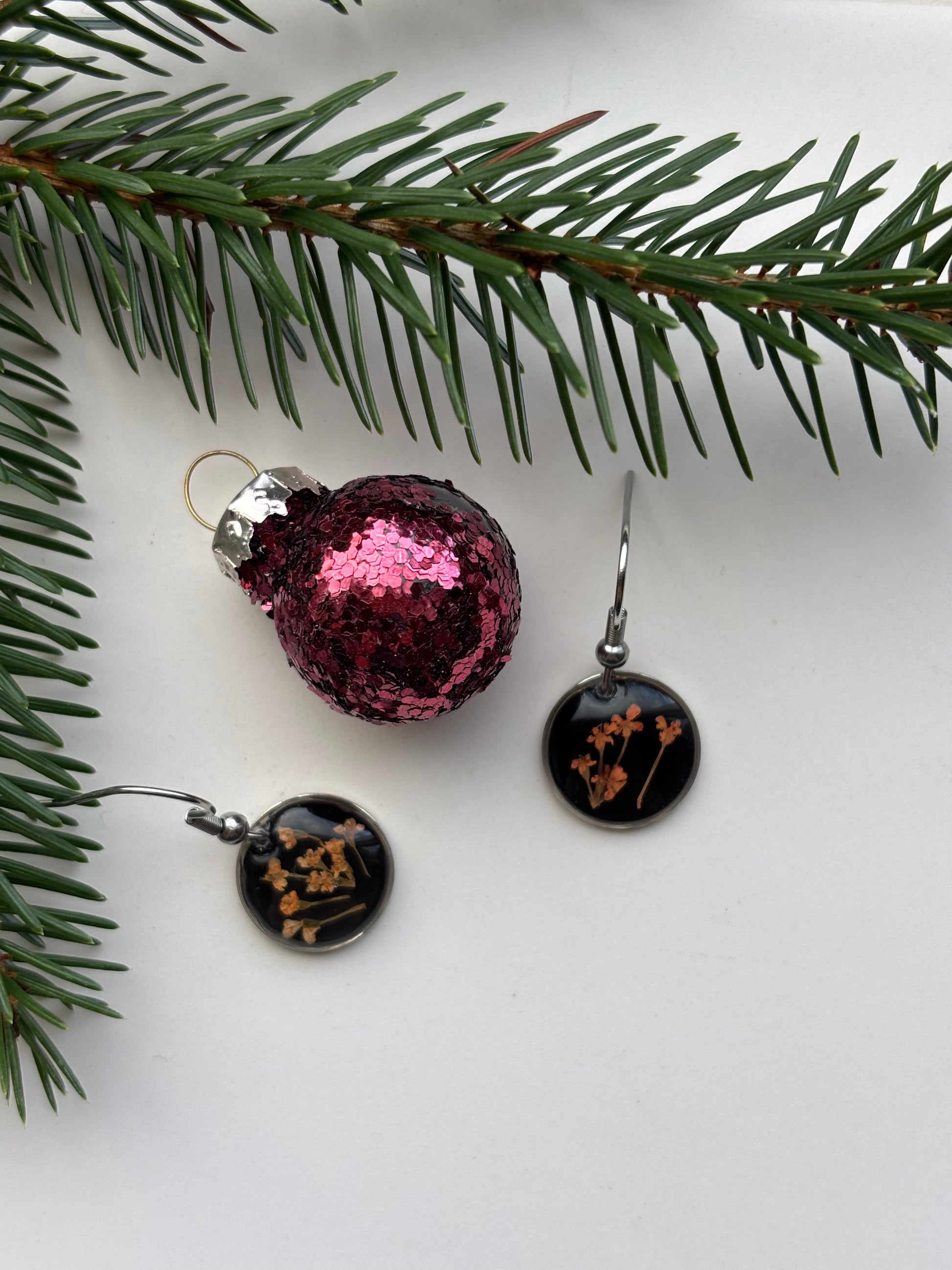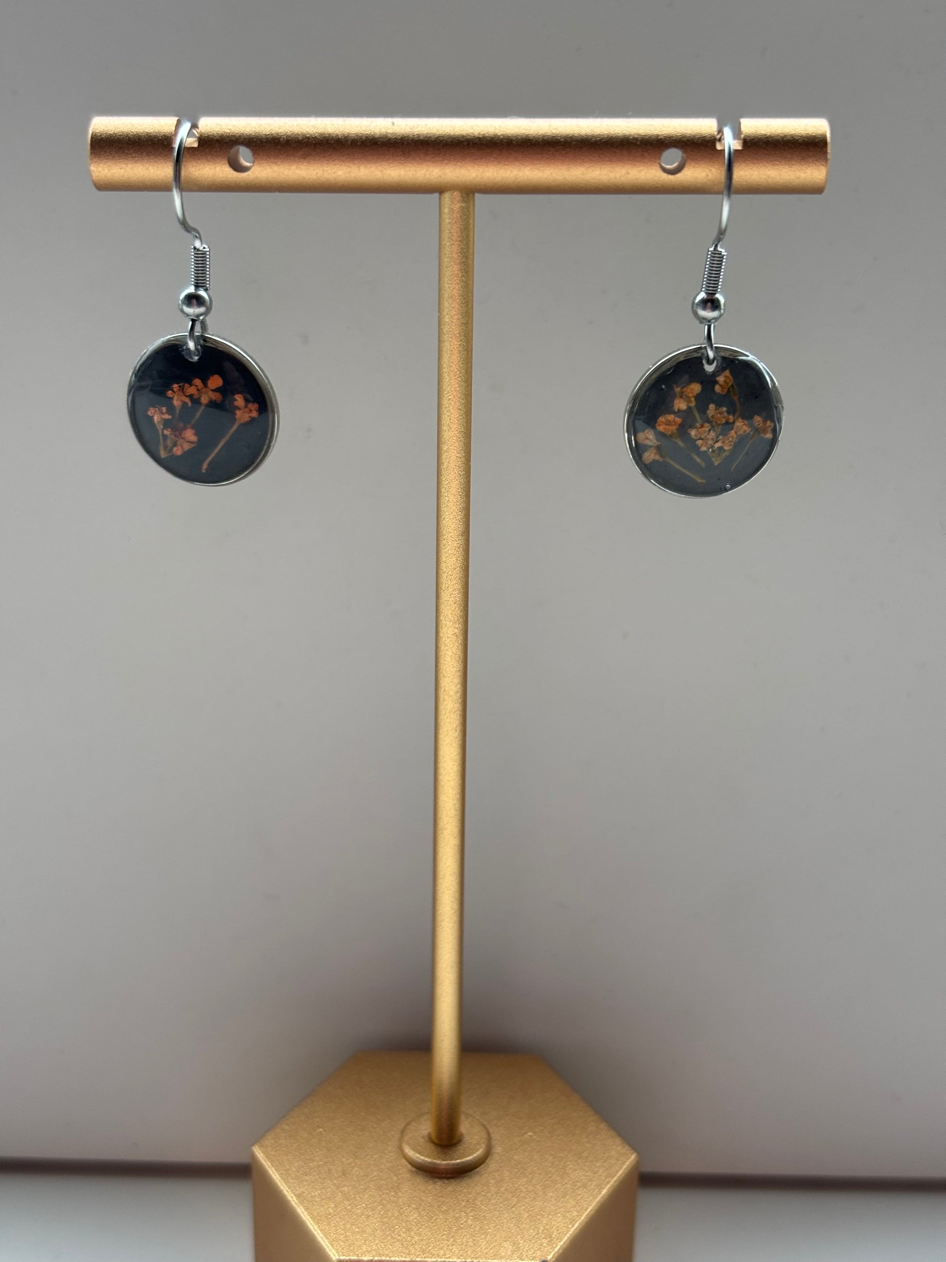 Een krachtig maar verfijnd botanisch accent in zilver. Deze handgemaakte oorbellen van echte bloemen bevatten een fijn oranje-wit dillebloemetje, dat prachtig oplicht tegen de diepe zwarte achtergrond. De combinatie van het heldere bloemetje met de donkere basis zorgt voor een elegant, modern contrast dat direct opvalt. De epoxyhars beschermt de bloem en laat alle natuurlijke details schitterend tot hun recht komen.
