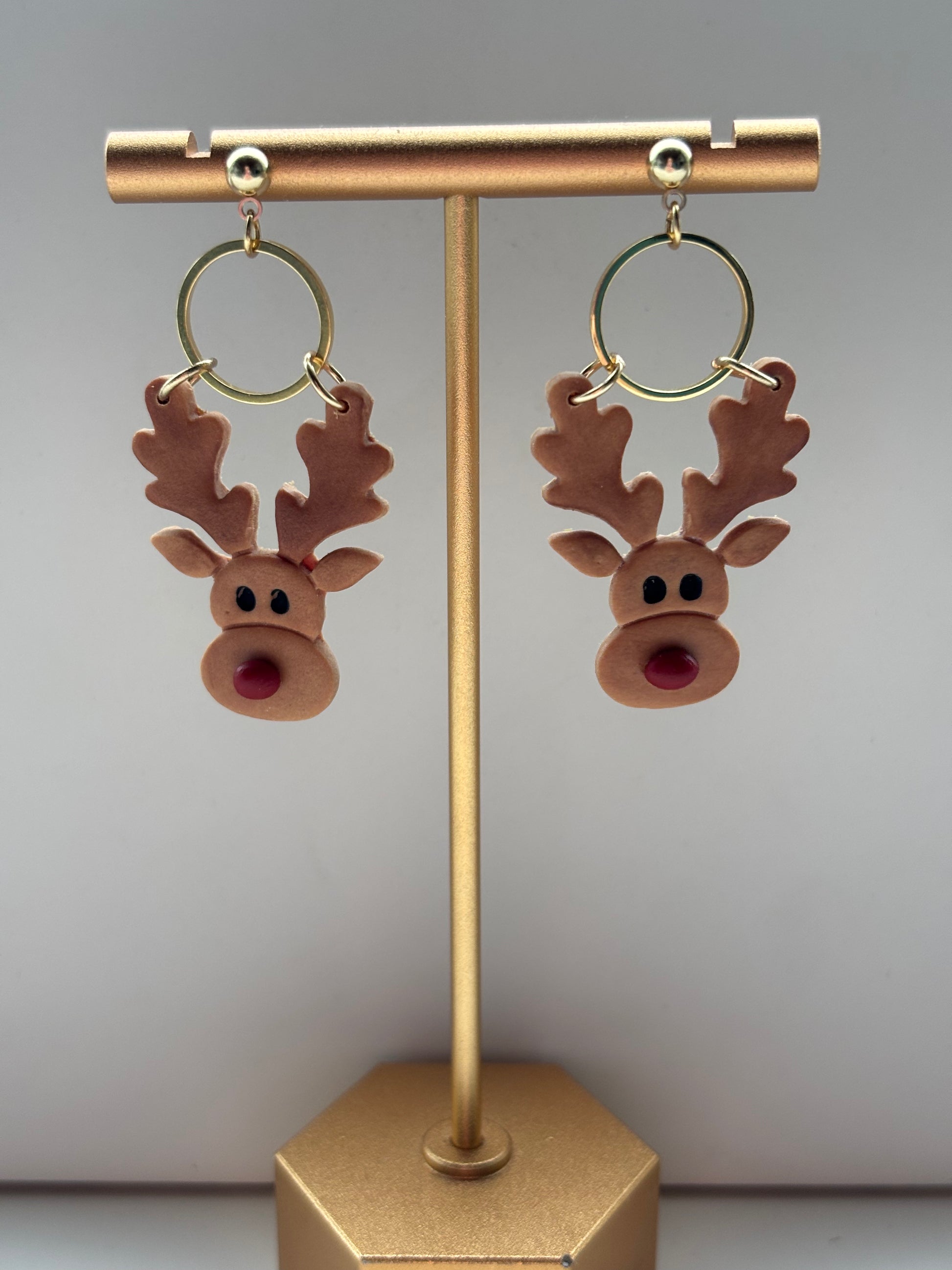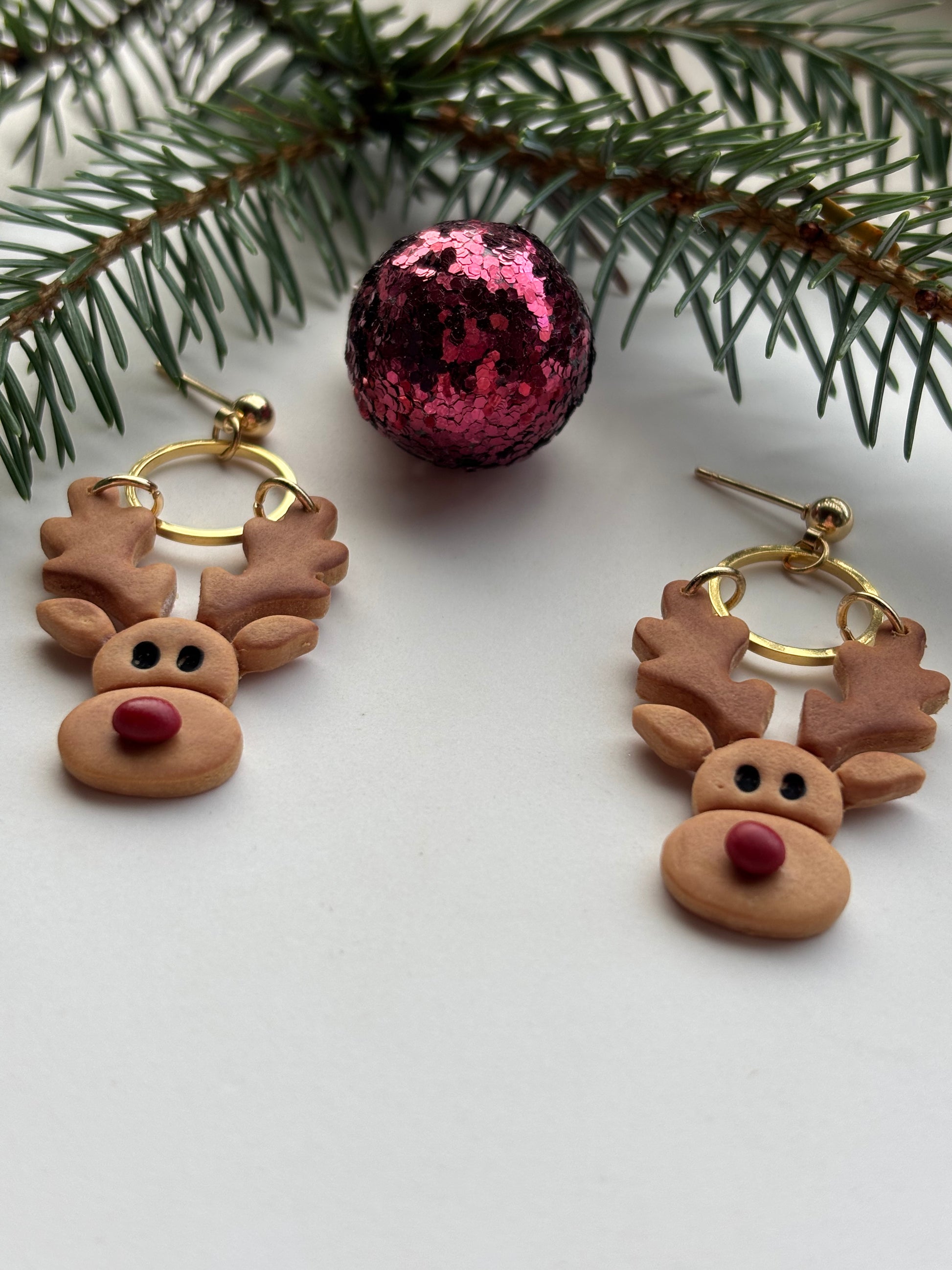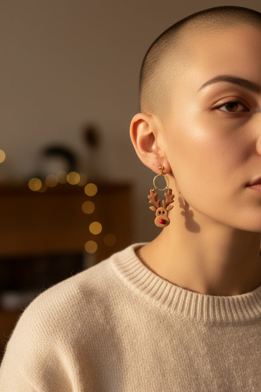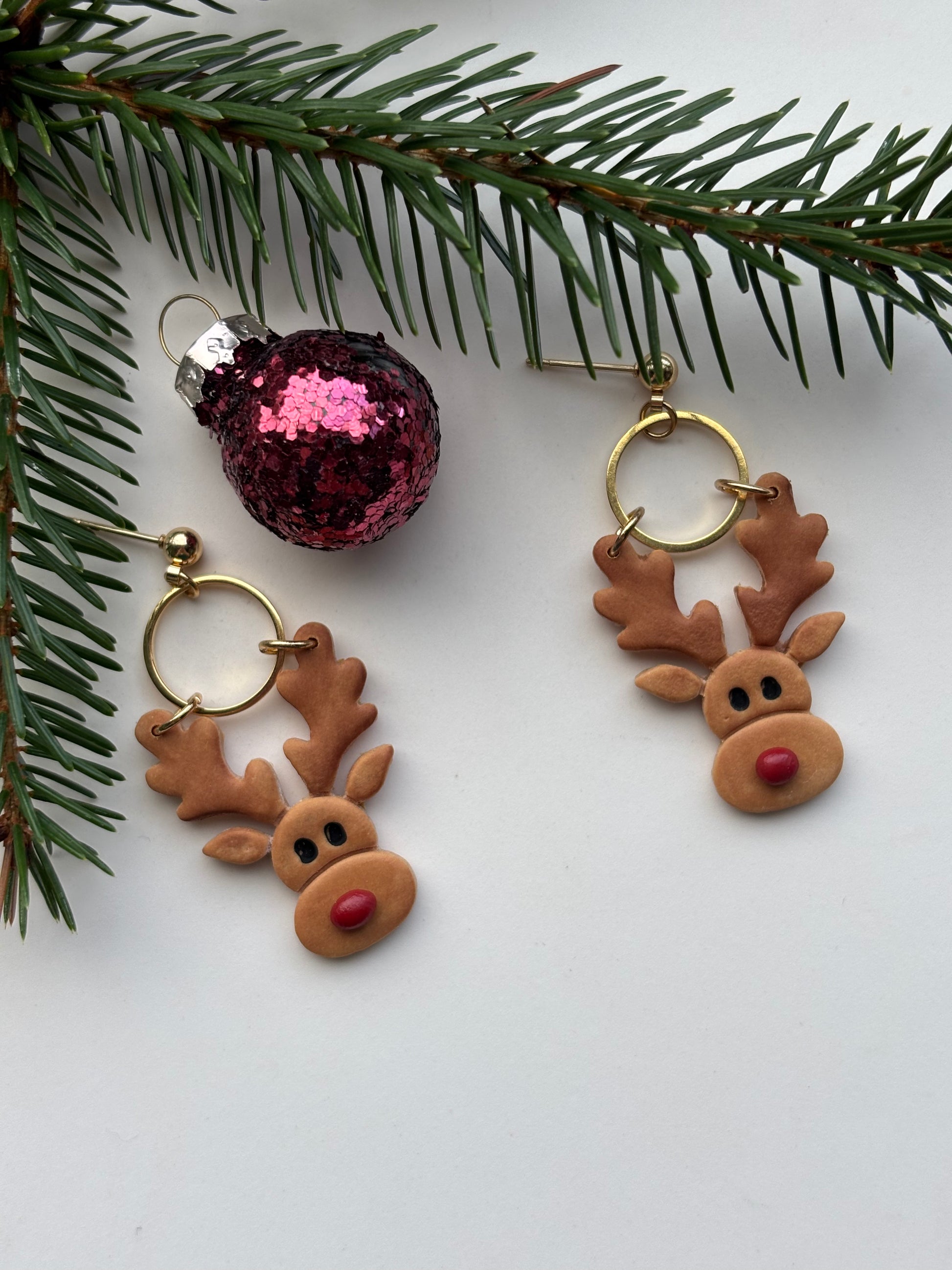 Een vleugje winterse vrolijkheid in oorbelvorm. Deze handgemaakte Rudolph-oorbellen van polymeerklei brengen het geliefde rendier tot leven met warme bruintinten en zijn kenmerkende rode neus. Het speelse ontwerp vangt de gezellige decembermagie – een sieraad dat elke winterse outfit een sprankje plezier geeft.
