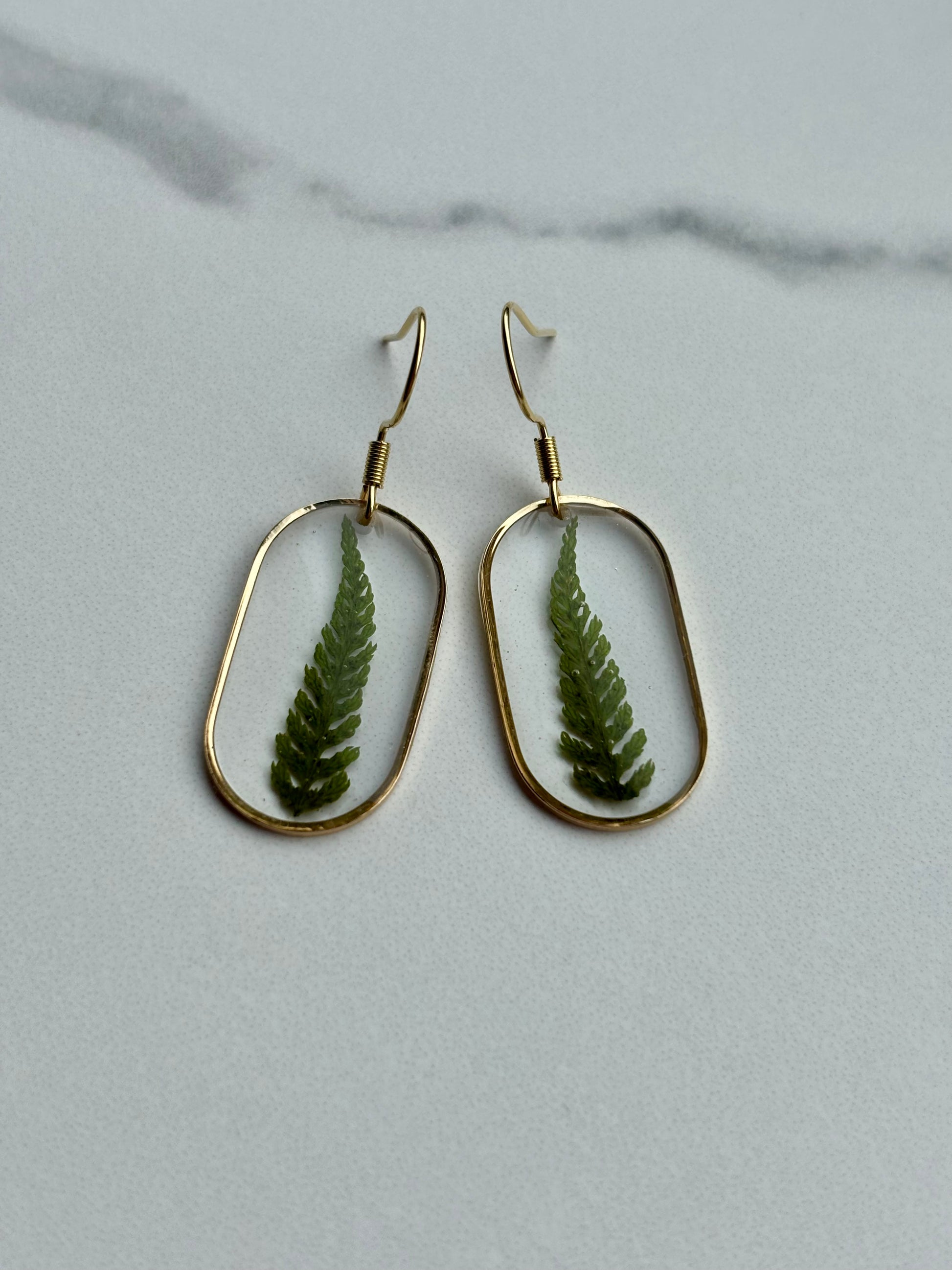 Handgemaakte oorbellen van echte planten (gedroogd varenblad) in transparante UV-resin