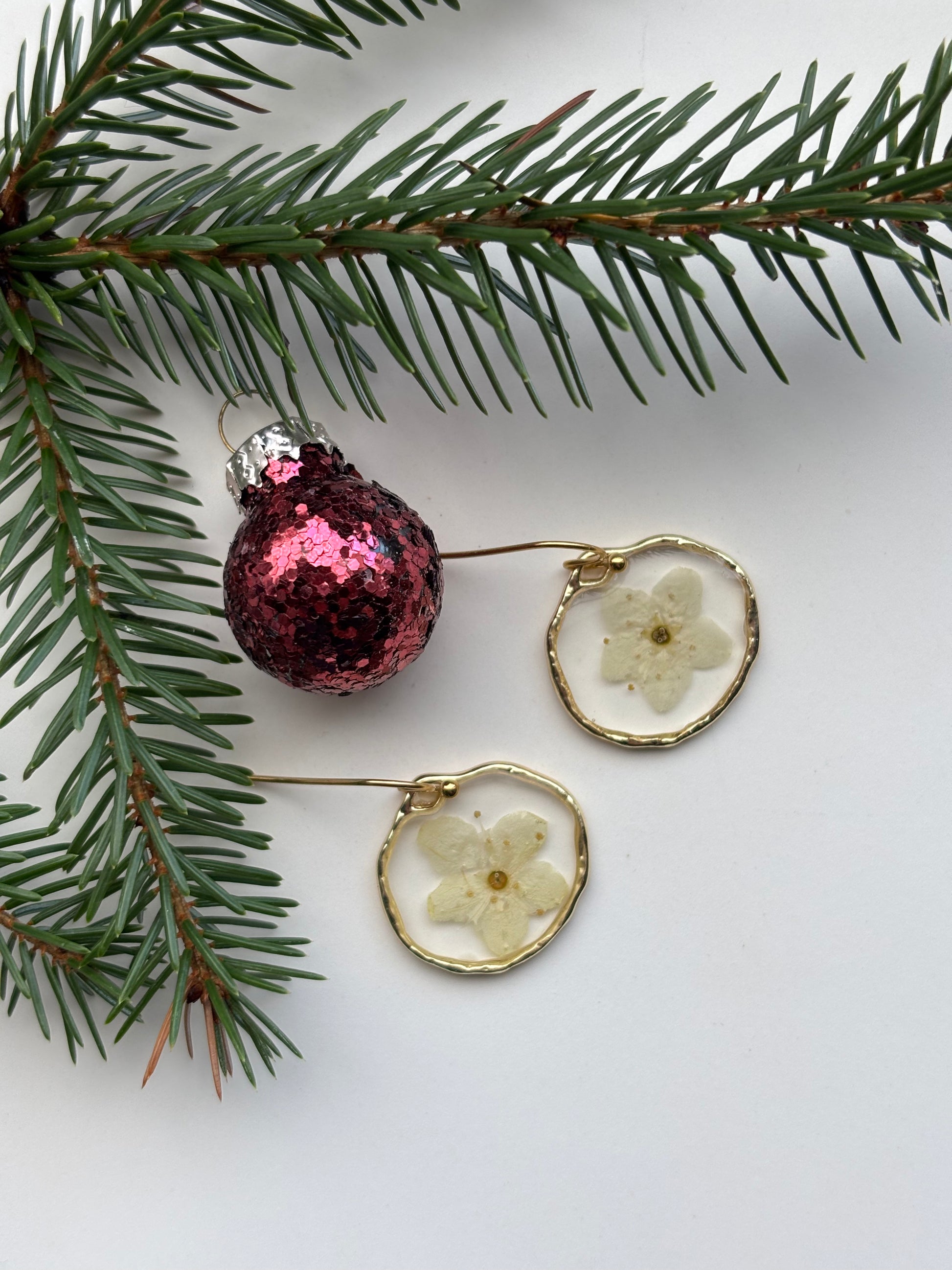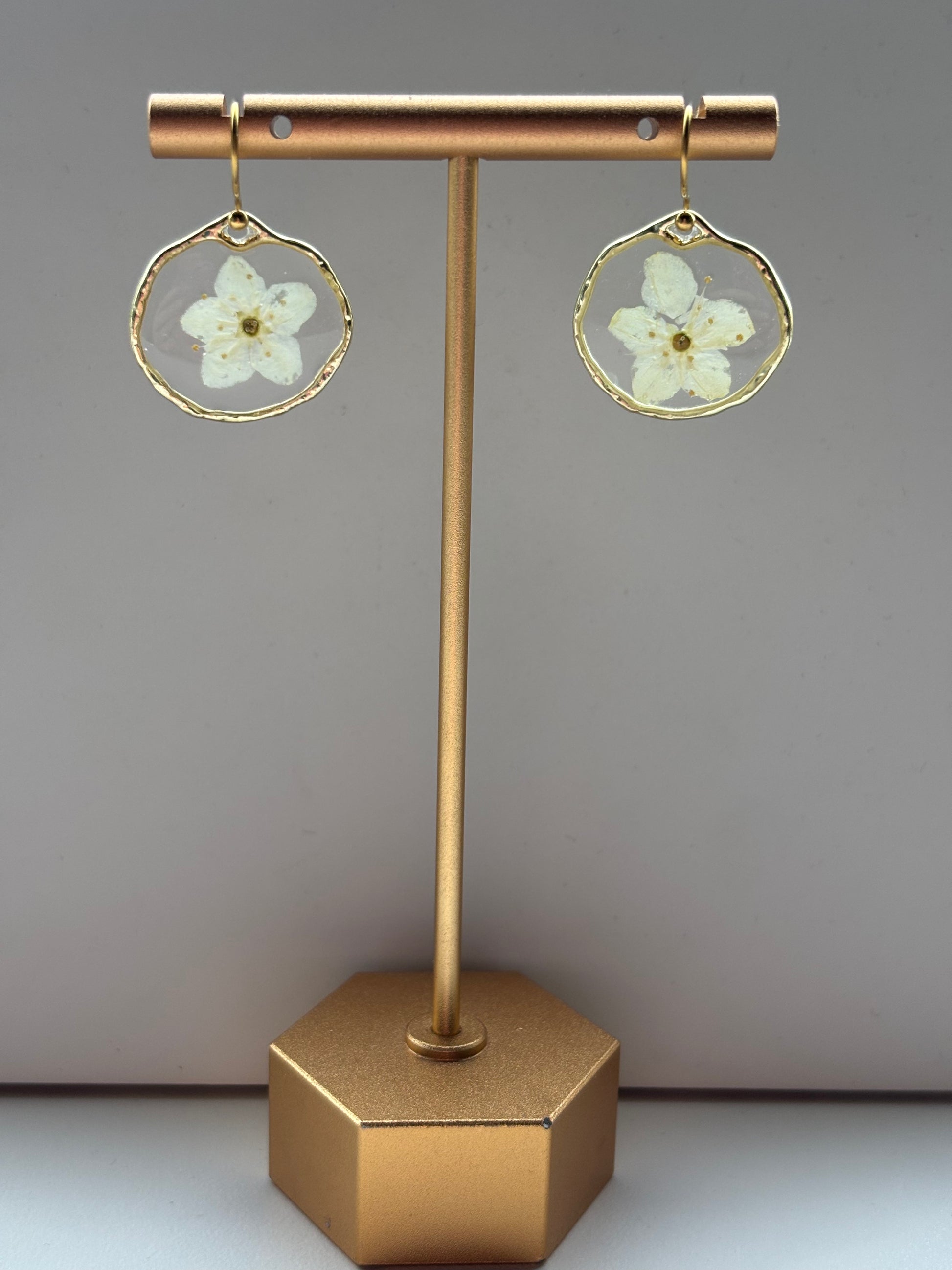 Een zacht, natuurlijk kunstwerkje voor elke dag. Deze handgemaakte oorbellen van echte bloemen bevatten een verfijnde sierpeerbloem, ingebed in heldere epoxyhars. De witte bloemblaadjes en subtiele details worden prachtig omlijst door de onregelmatige, organische rand, waardoor elke oorbel de uitstraling heeft van een klein natuurfragment dat je met je meedraagt.