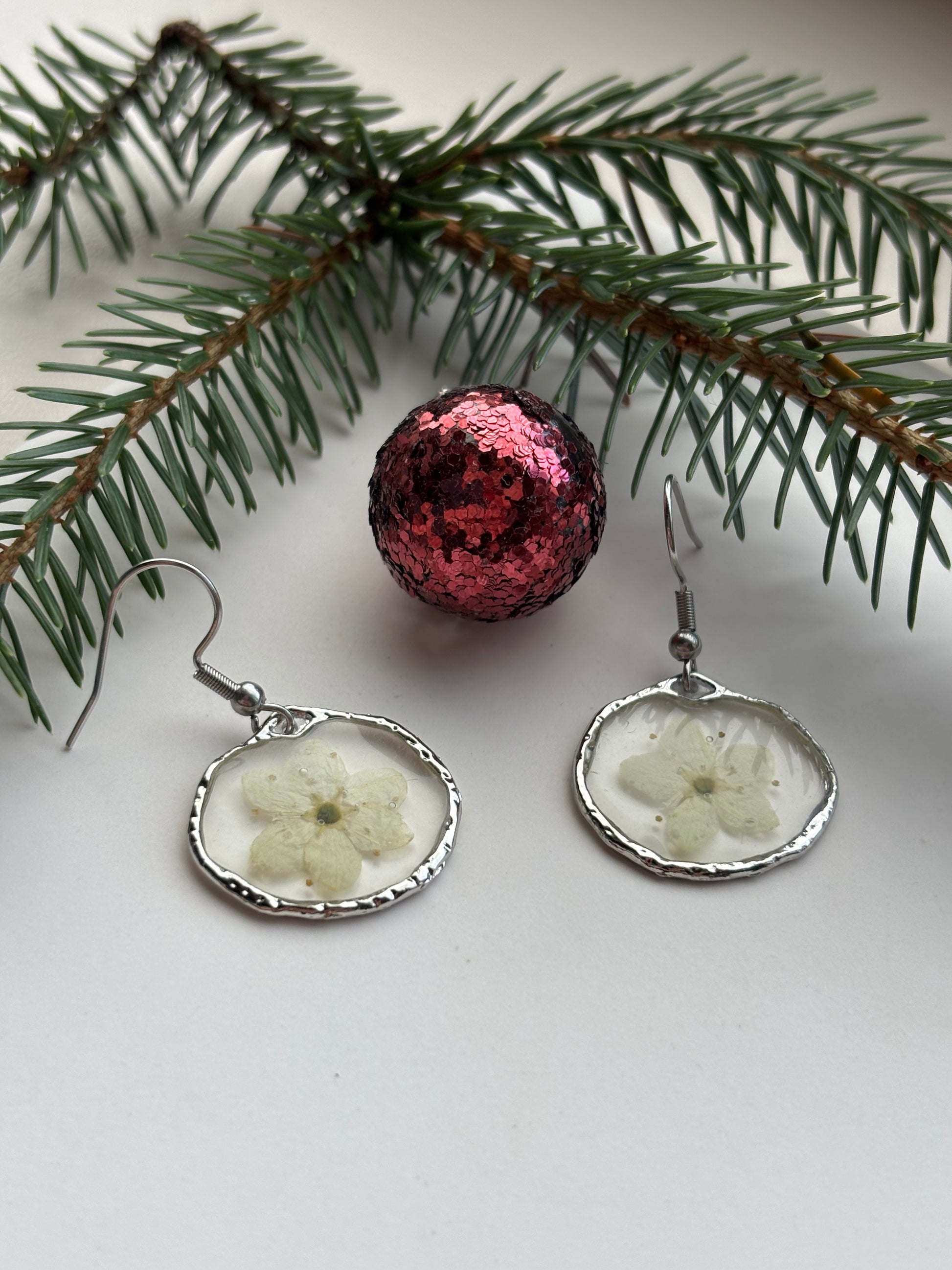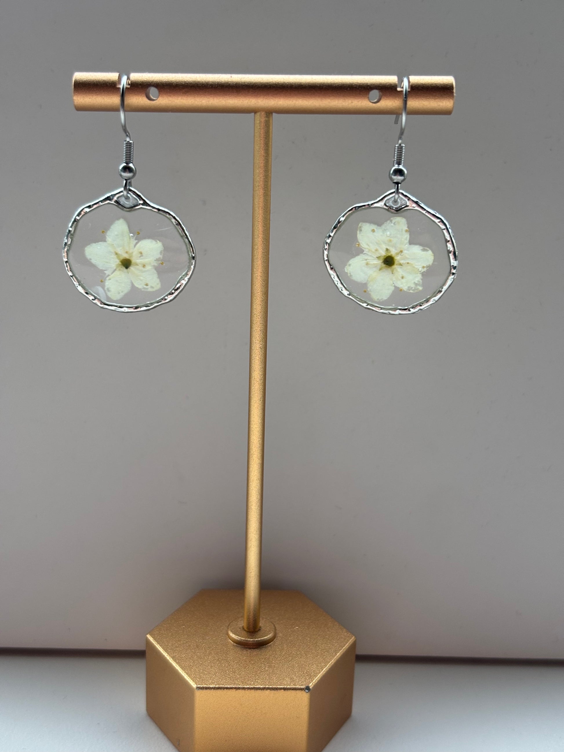 Een zacht, natuurlijk kunstwerkje in een frisse zilveren uitvoering. Deze handgemaakte oorbellen van echte bloemen bevatten een verfijnde sierpeerbloem, ingebed in heldere epoxyhars. De witte bloemblaadjes en fijne bloemdetails komen prachtig naar voren binnen de onregelmatige, organische rand, waardoor elk paar de uitstraling heeft van een klein natuurfragment dat je met je meedraagt.
